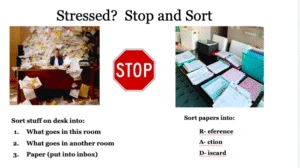 In addition to helping you get your actionables under control, you’ll learn how to get your desk under control. A cluttered desk can impact your productivity, focus, creativity, and clarity. Not to mention really stress you out. Using my exclusive Stressed? Stop and Sort strategy ™, you will learn how you can clear your desk in 15 minutes or less and get your brain back to a state of calm and focus.